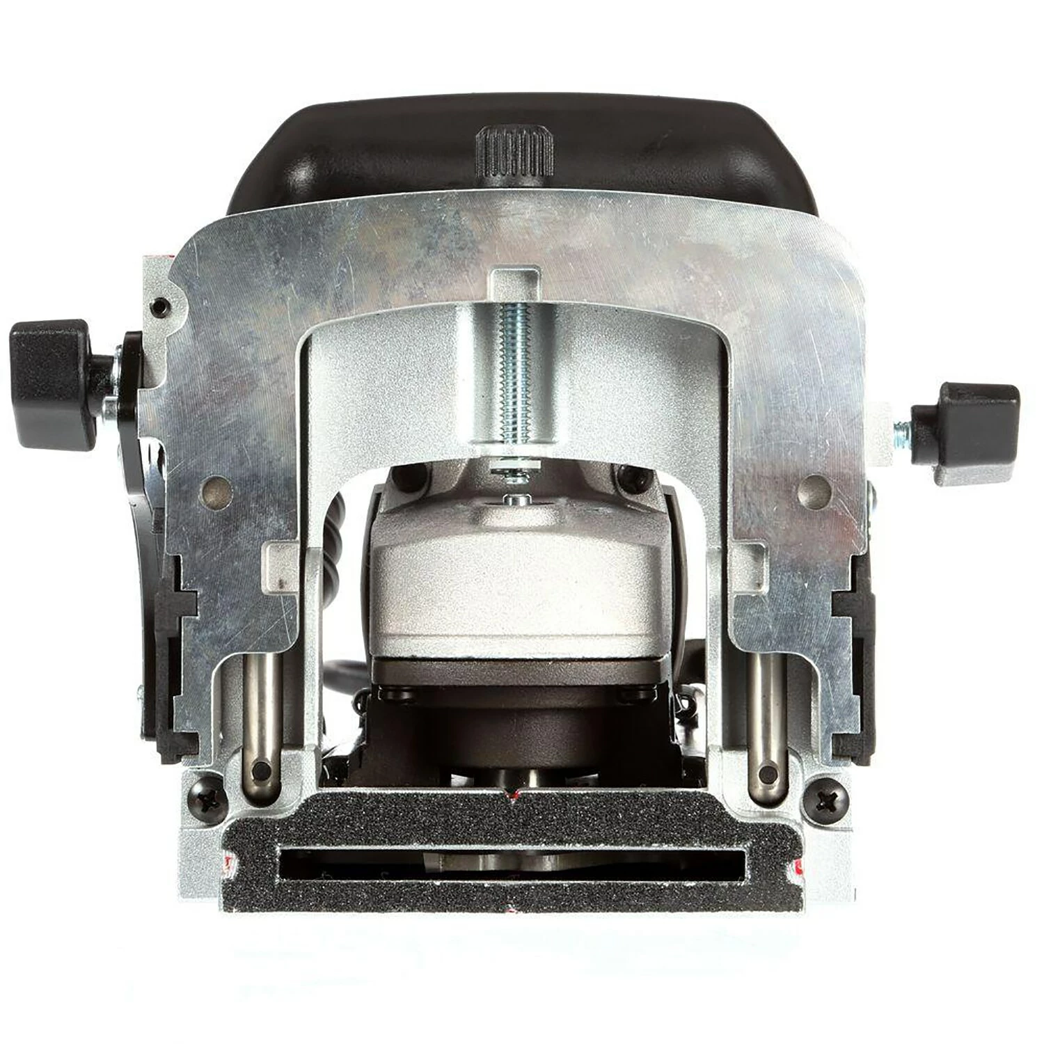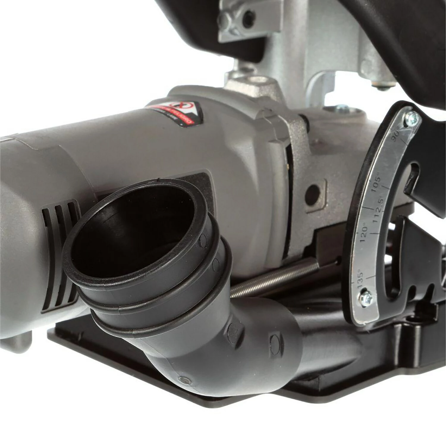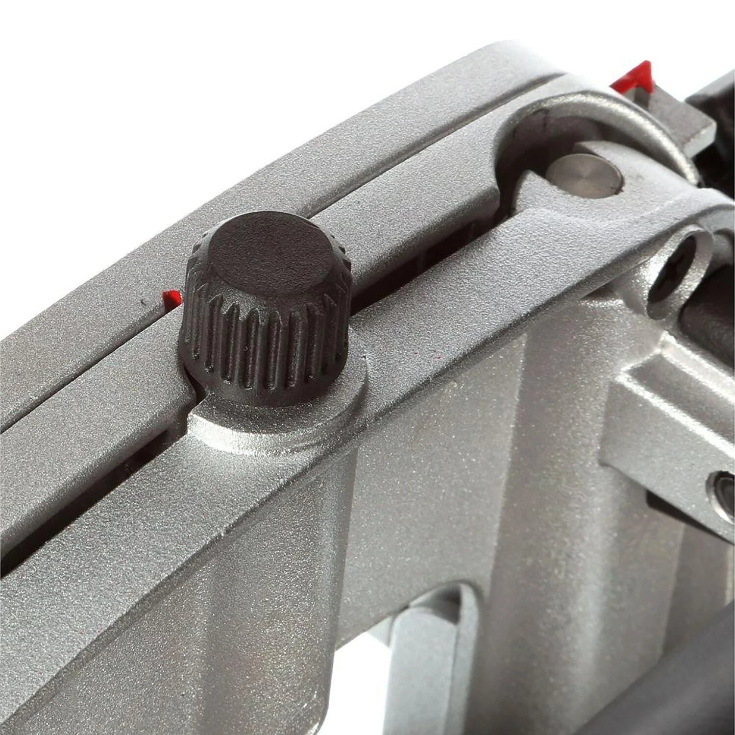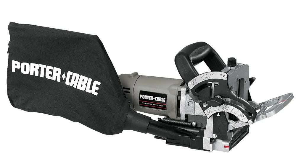 PORTER-CABLE® deluxe plate joiner features 7.5 Amp motor, which generates 10,000 RPM. Its 1 In. outside diameter dust port accepts standard bag or can be connected to a vacuum. Fence tilts from 0-135 degrees, with positive adjustable stop at 90 degrees. Includes precise micro height-adjustment knob, lock-on trigger. Height scale is accurate at any angle. Seven-position rotating depth stop for FF, #0, #10, #20, simplex, duplex, and max (#6) biscuits. Spindle lock for easy blade changes. Bale handle attached to fence rather than motor, for greater stability and added control during cuts.
