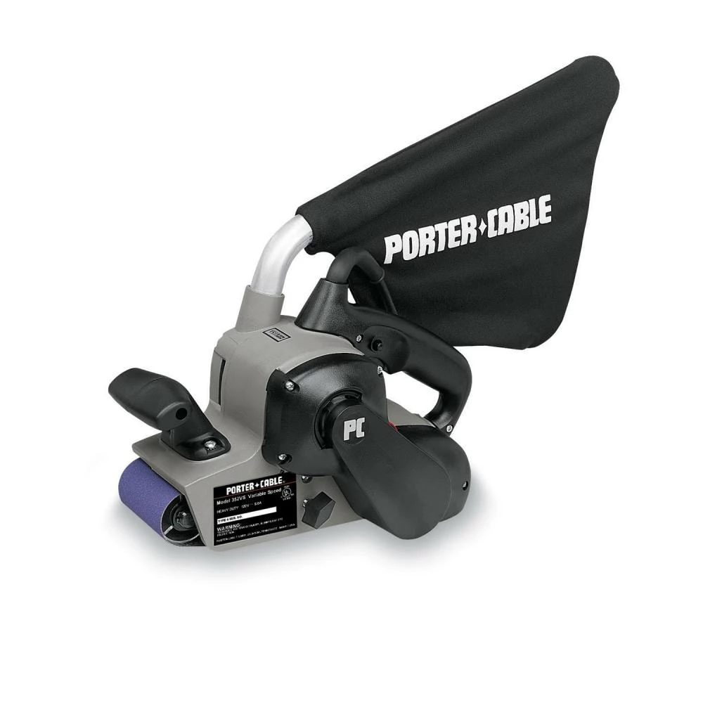 8 amp motor. 850-1,300 pm. Rotating dust bag. Self-tracking belt. Lever action for easy belt replacement.