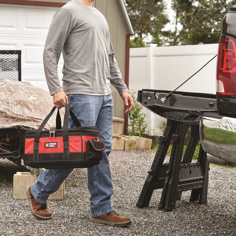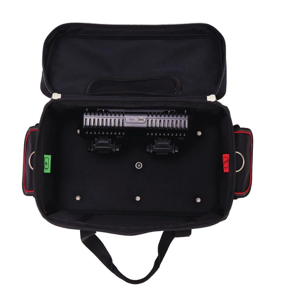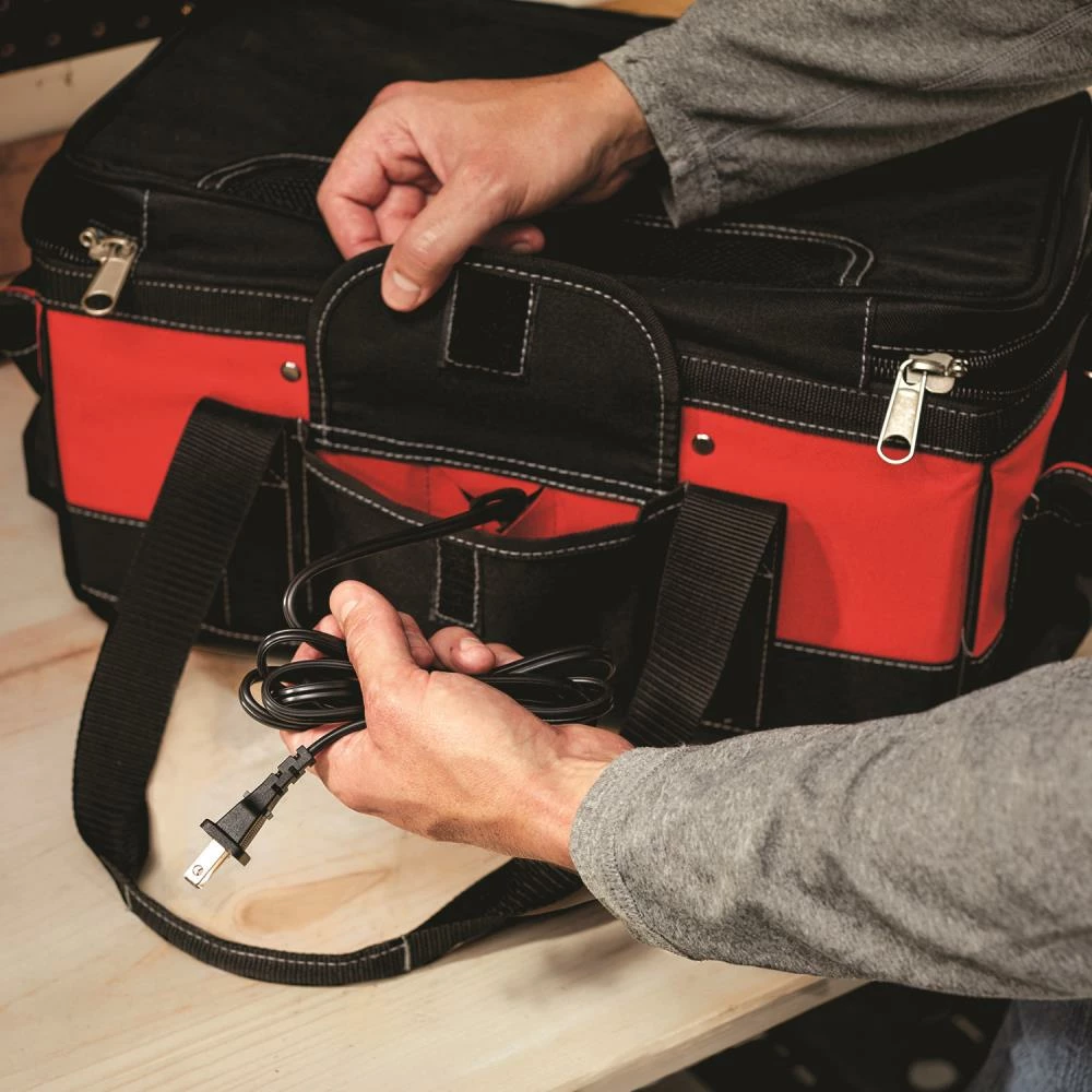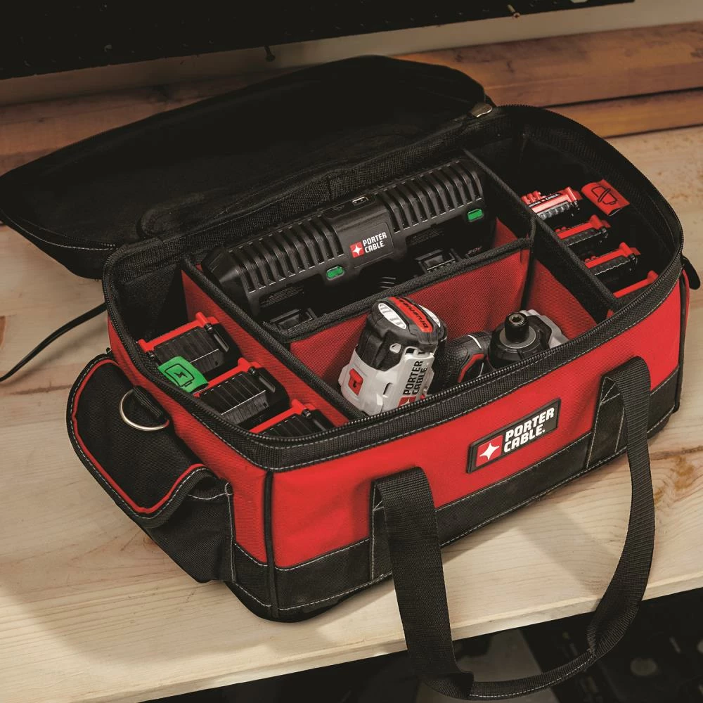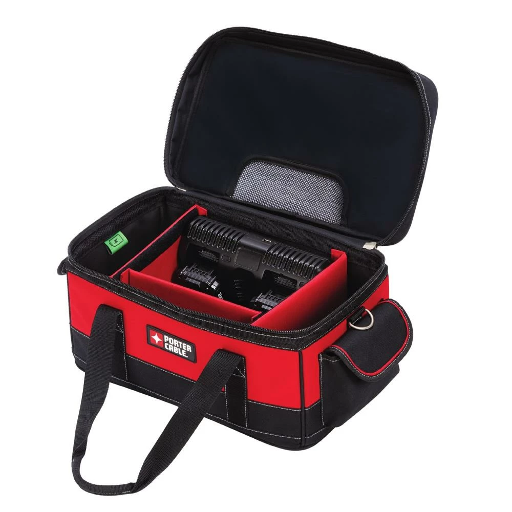 The PCCB122C2 power tool battery charging bag includes 2 compact 20 V MAX* batteries and a removable dual port charger with a USB port. The bag has the ability to store up to 10 batteries or 2 tools and comes with a divider section to keep charged and uncharged batteries separate. The dual port charger will fully charge 2 batteries simultaneously in just 40 minutes.