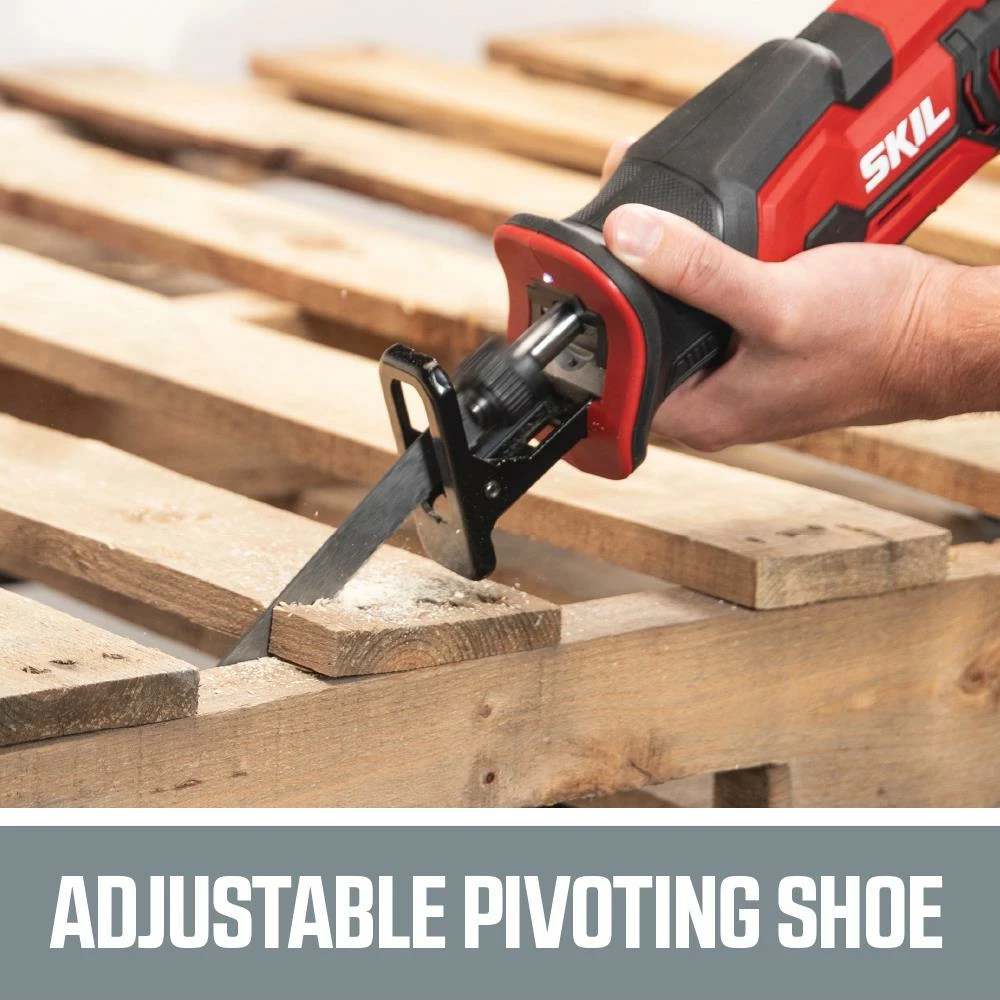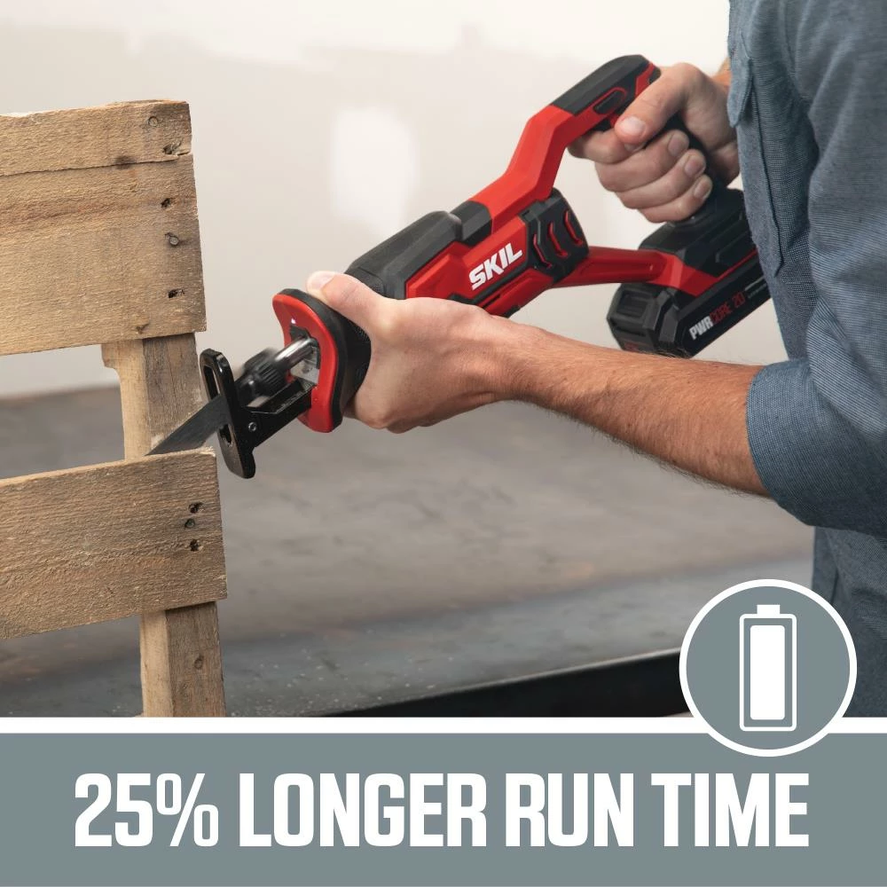 Make multiple DIY projects easier with the SKIL 20-Volt Reciprocating Saw, featuring a 1-inch stroke and up to 3,000 SPM. This cordless electric saw is powerful enough to cut through several materials such as wood, tree branches, fiberglass, metal, plaster, masonry, drywall, and even nails. Its exposed blade makes it easy to cut through materials in tight places, and the lightweight design allows easy handling. This power saw comes with a PWRCore™ 20-volt 2.0Ah lithium battery and 20-volt charger.